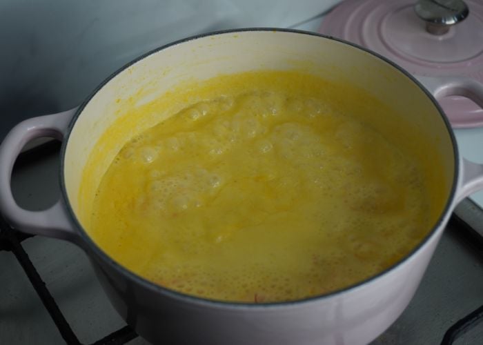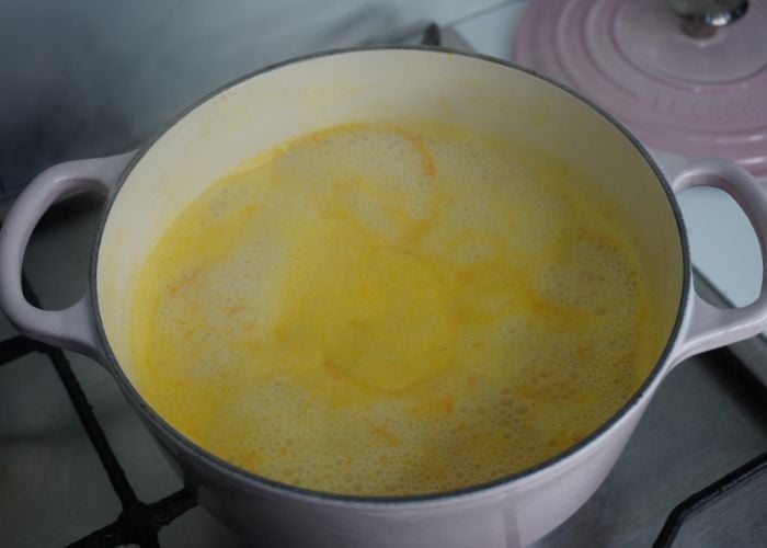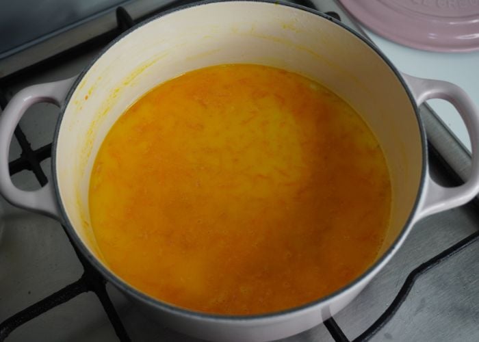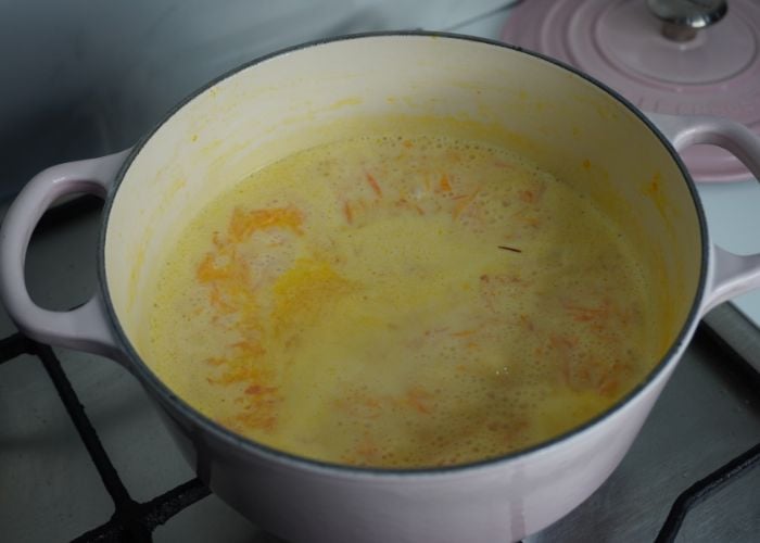6)Mix this and bring it to a full boil. Once it starts boiling, reduce the flame and cook for 10 to 15 minutes until carrot is completely cooked.