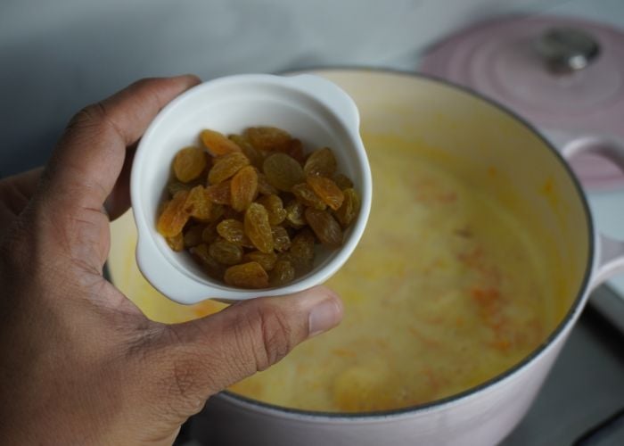 9)Add in raisins. This is optional. I like it because, as it cooks in the milk. It swells up and becomes more sweet and soft. But you can skip it.