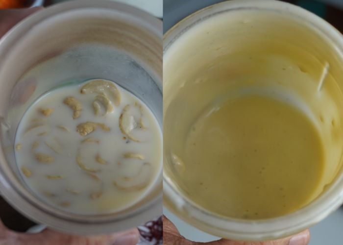 - Soak Cashews in warm milk for 15 minutes. Take it in a blender and grind to a smooth fine puree. set aside.