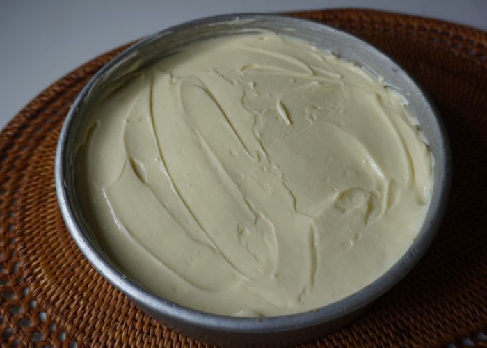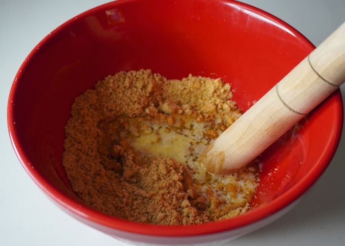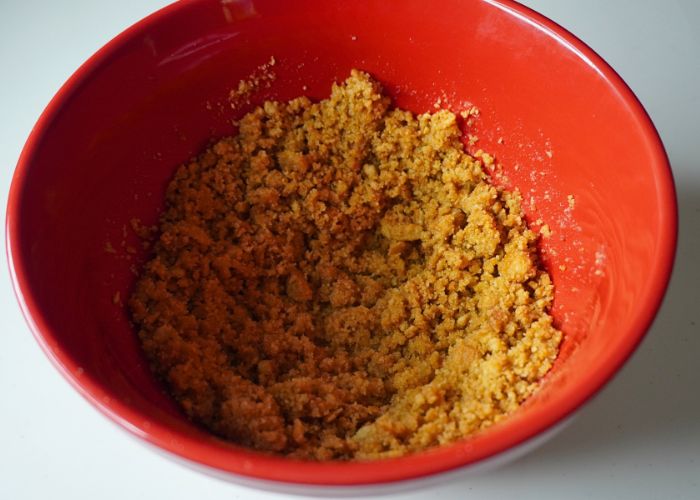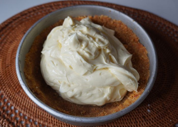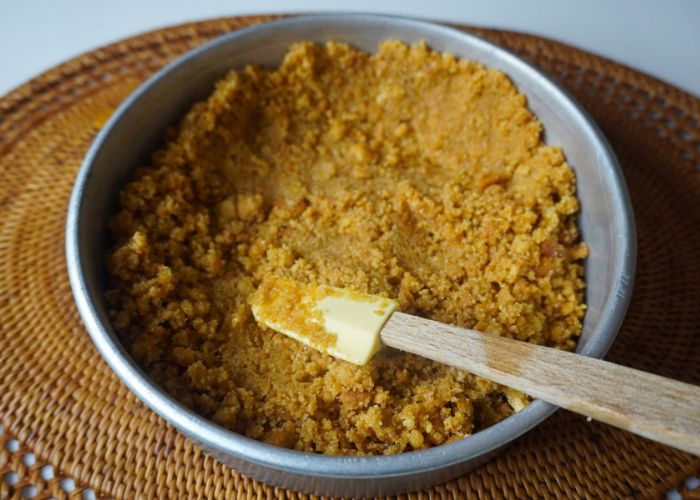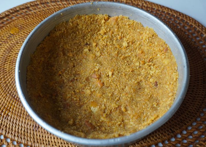 - Start with biscuit base, Take biscuits in a bowl, crush biscuits slightly. I like texture in my crust, so I use a rolling pin and crush the biscuits in a bowl. Add melted butter to the crushed biscuit and combine well. Take a removable base cake pan, add the biscuit into the pan. Spread evenly using a spatula. Now press firmly to line the base. Once the base is lined place the pan in fridge or freezer to set for at least 30 minutes.