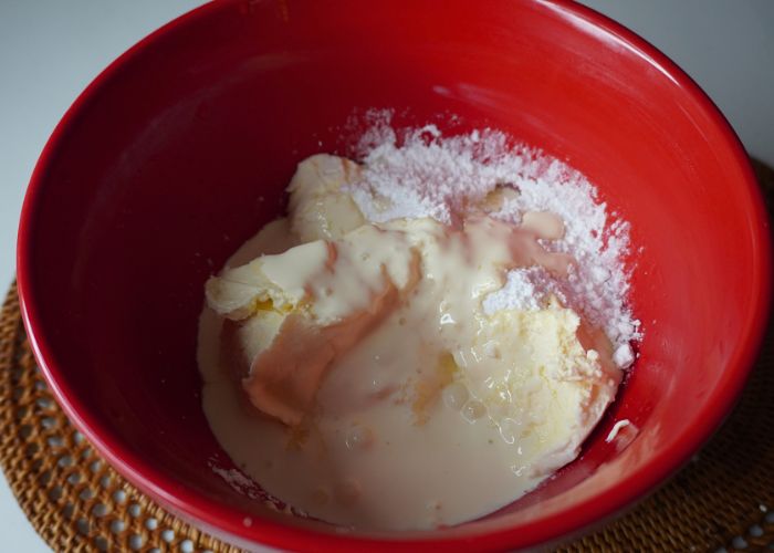 - To make cheesecake filling, it is super easy. Take cream cheese, cream, powdered sugar, vanilla, salt, lemon juice in a bowl and use an electric beater to combine this for just 40 seconds to 1 minute. If you don't have an electric beater you can mix this with whisk. Take the cake pan from freezer. Spoon this cheesecake filling over the crust, spread evenly and place in fridge to set overnight.