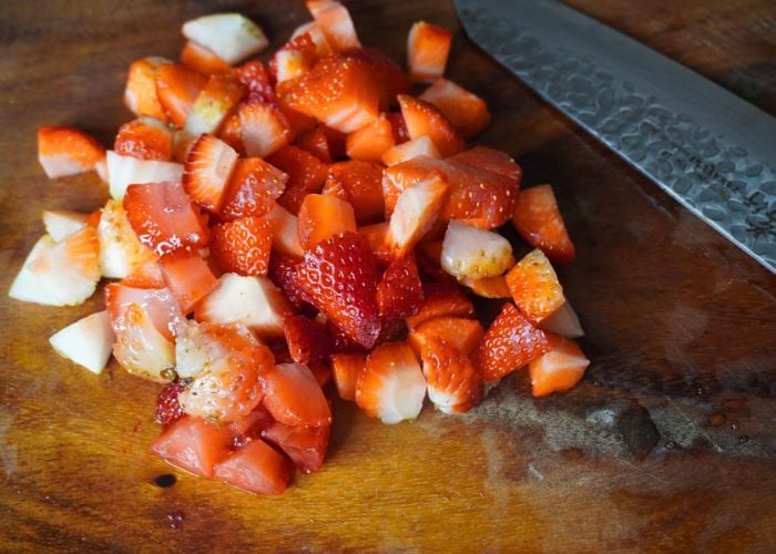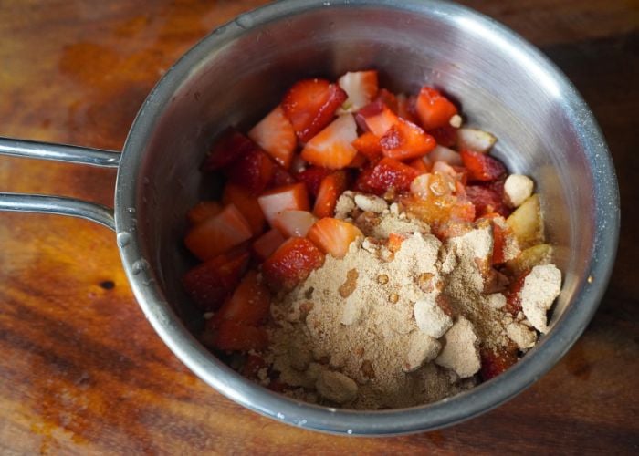 13)Cook strawberries with sugar and lemon juice till thick and jam like. I used date sugar, you can use any sweetener.