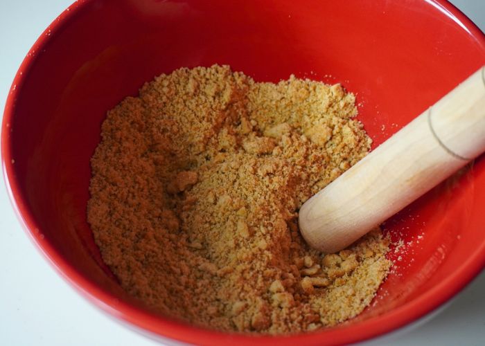 2)I used a rolling pin to crush them. Since I like to have different texture in the crust, i use rolling pin. You can powder this in blender or even in food processor.
