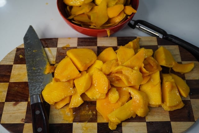 1)Take ripe mangoes, peel off skin and chop them into pieces.