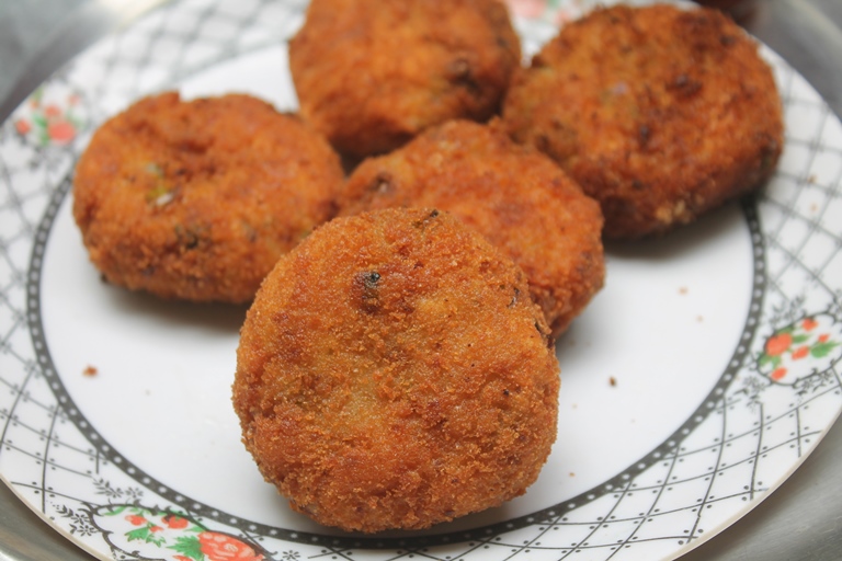 - Take cutlet and coat with the flour coating and then the breadcrumbs. Once it is well coated, drop in hot oil and fry till crispy.