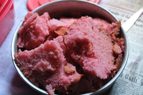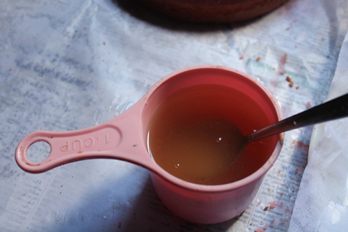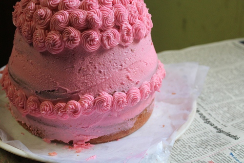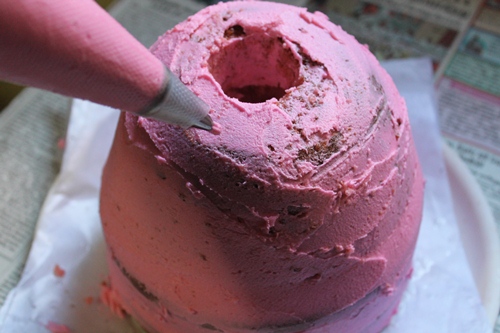 - Now make sugar water by mixing everything. Take a plate and place a round cake on that. Place strips of parchment surrounding the cake. Brush the cake generously with sugar water. Now spread butter cream on top and place another cake on top, brush with sugar water, spread buttercream on top. Now take the bowl cake half and top with sugar water, place it on top of the frosting and spread some more buttercream, place the final half and brush it with sugar water.