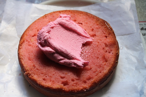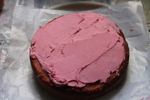 | now i took the bottom half of the domed cake, brushed sugar water on the sides of the cake |