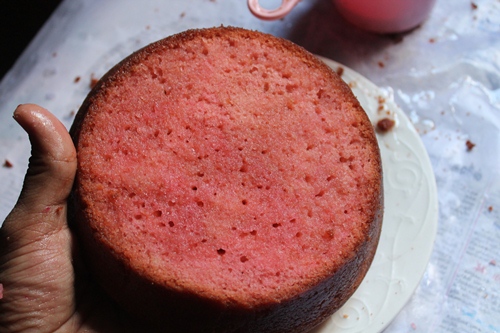 - Now remove the cake and cut the doom in the top to make it even. Take the cake which is baked in bowl and cut it in half.
