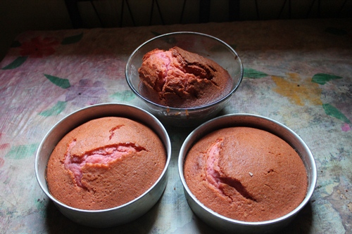 - Divide this between the batter. Fill the round cake pan just half way through. Now pop this in oven and bake for the round cake for 35 mins. Bake the the cake in bowl for an hour or till the cake is baked. Remove the cake from oven and let it cool completely. You can even freeze the cake for 30 mins.