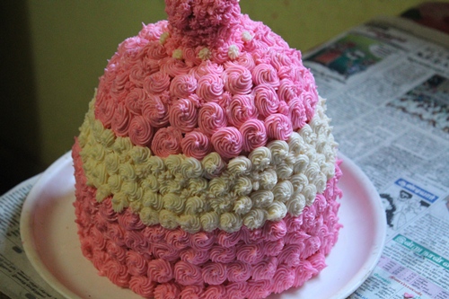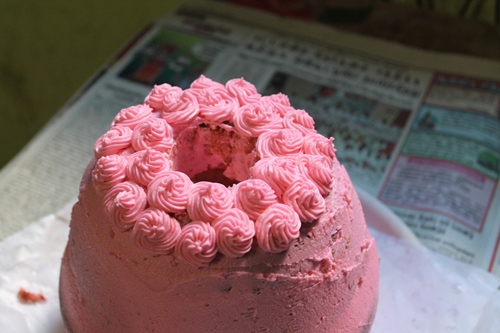 | now i realised that i forgot to remove the centre part for inserting barbie..So i took a knife and sliced the middle part throughout the cake |