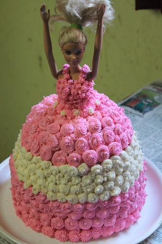 - Now pipe the cake with butter cream, insert barbie and decorate it as shown in pics.