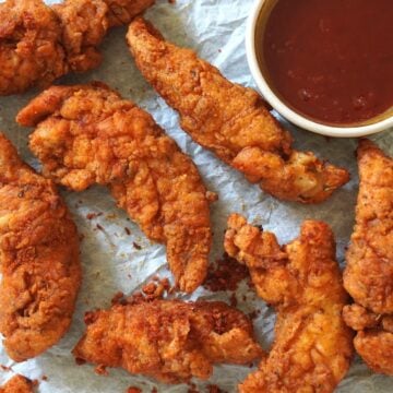 Batter Fried Chicken is a delicious crunchy chicken strips which has a crispy coating which is lightly seasoned with spices. It is super crunchy and stays crunchy for a long time. You can check out my chicken strips recipe.