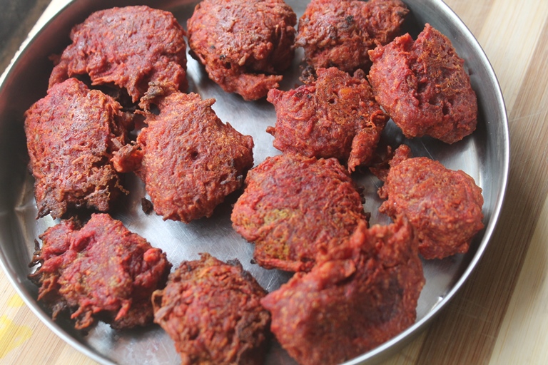 - Heat oil for frying. Drop spoonful of batter in hot oil and fry till golden.