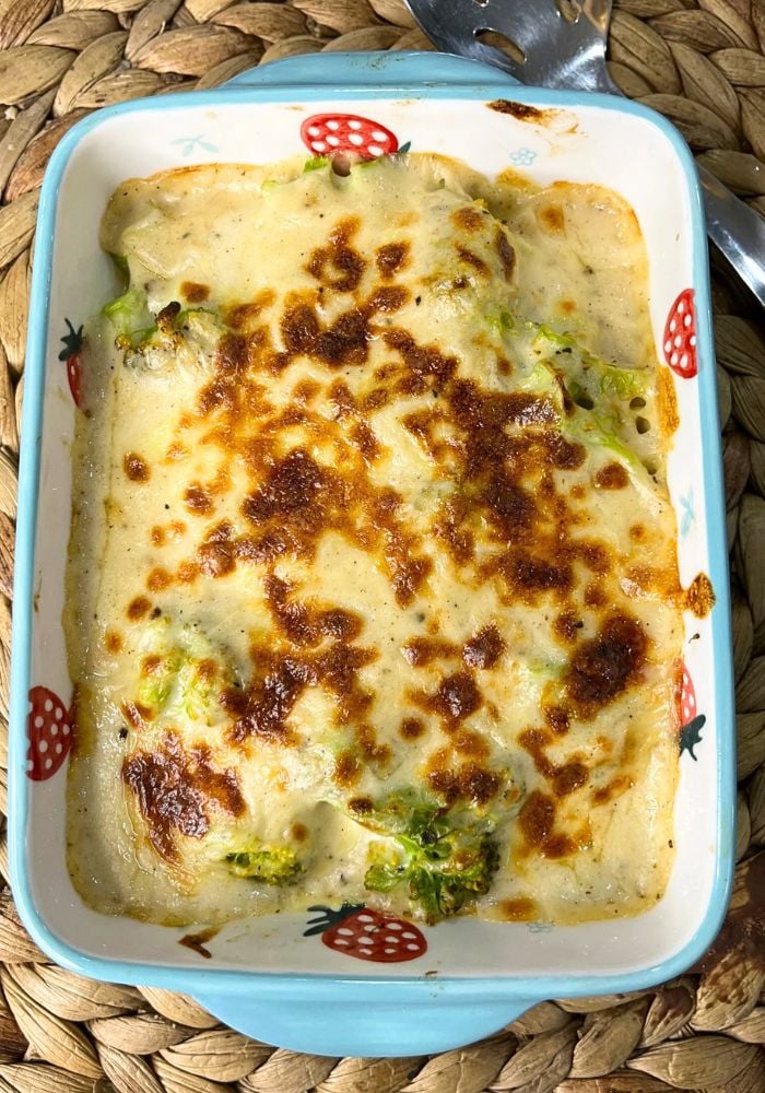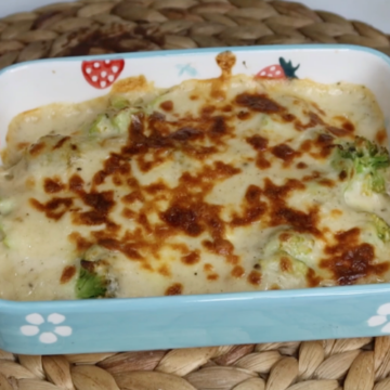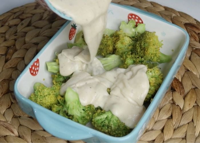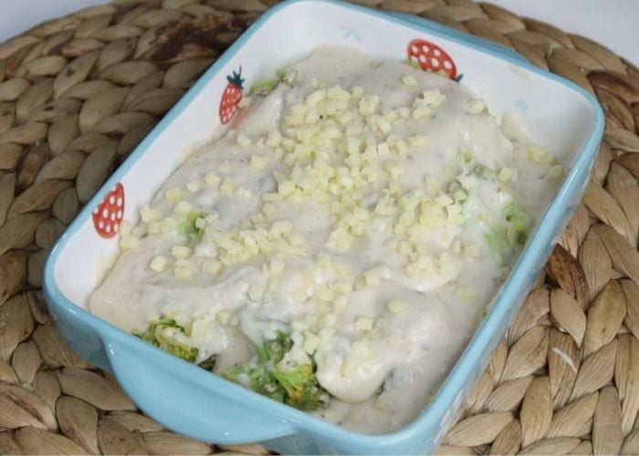 - Take a baking dish. Add cooked broccoli into the dish. Pour cheese sauce over it and top with remaining cheese.