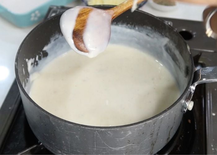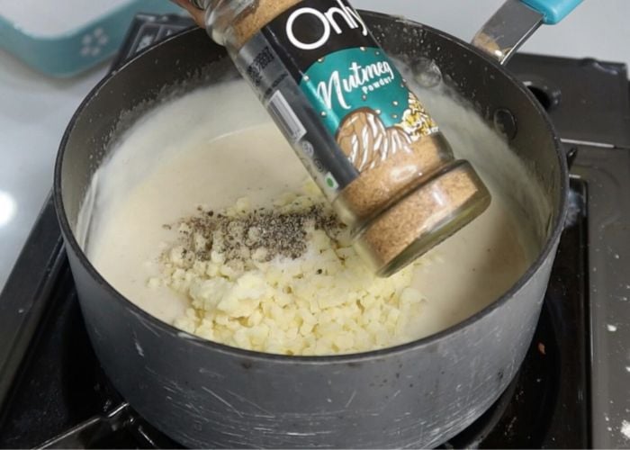 - Add in flour and stir fry for a min. Add in milk and mix well. Stir till it thickens. Finally add in salt, pepper and nutmeg. Mix well. Stir in ½ cup of cheese and mix till cheese is melted.