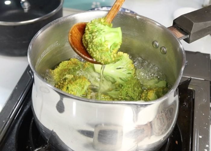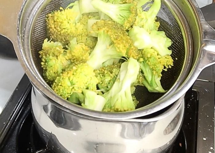 - Bring water to a boil. Add salt to it. Add in broccoli stems and florets. Cook for 1 min till it gets bright green in colour. Drain them and set aside.