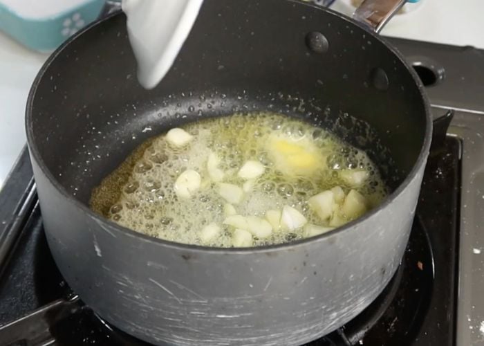 - Heat butter in a sauce pan. Add in garlic and saute for 10 seconds till fragrant.