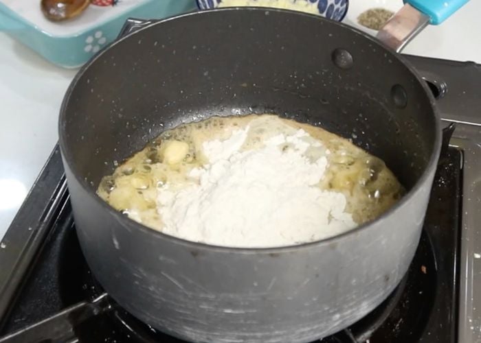 4)Add in plain flour into the butter and stir fry for a min.
