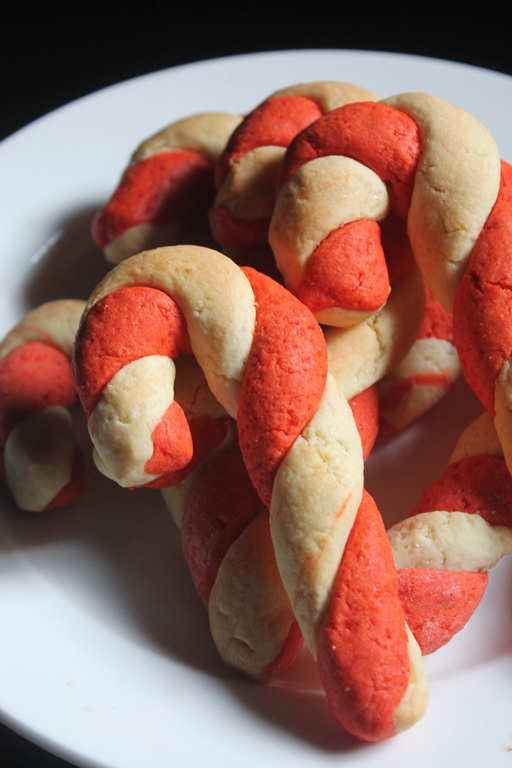 Candy Cane Cookies Recipe with step by step pictures. This is made with Flour, sugar and butter. The ingredients used are basic sugar cookie dough which is shaped into candy cane like shapes.
