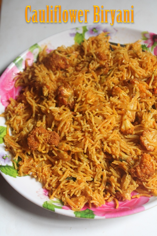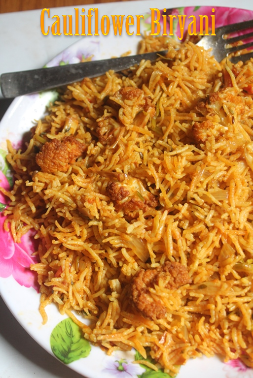 Biryani is what i often make, at least once in two weeks. Since it is so easy to make, plus it taste divine. I have quite a few biryani recipes in my blog and each one is made different. Biryani taste different each time by the veggies you use and the method you make. This one is made using cauliflower and it taste just delicious.