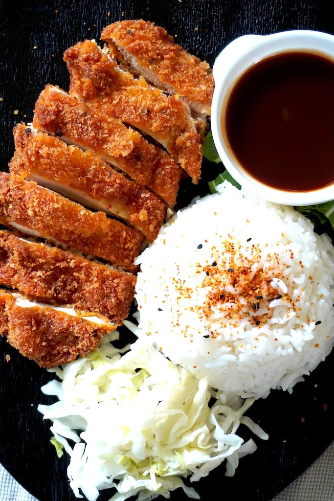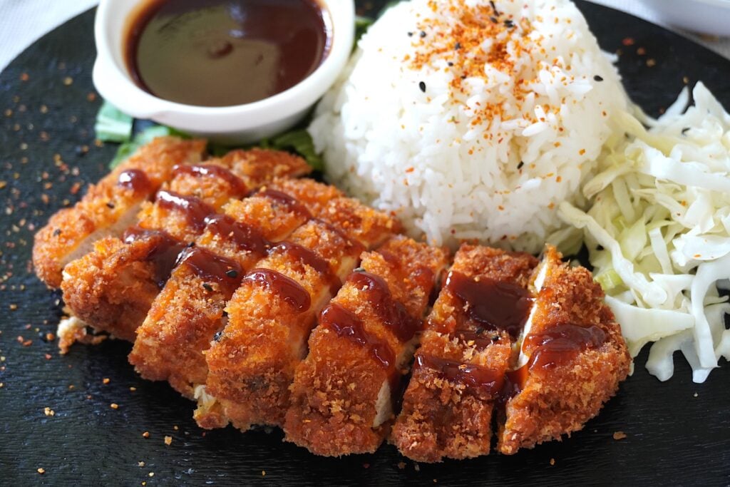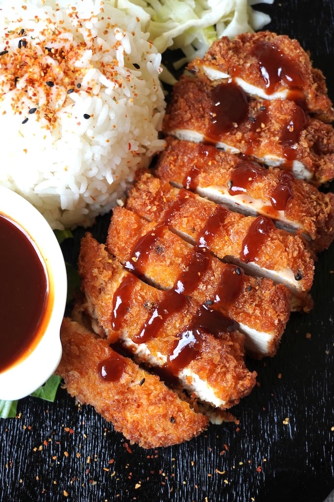 Chicken katsu is served with shredded cabbage, Japanese mayonnaise (kewpie mayo) and tonkatsu sauce. It is a popular Japanese dipping sauce. Tonkatsu sauce is made with a combination of ketchup, worcestershire sauce, sugar and oyster sauce.