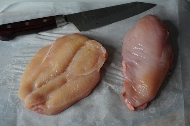 - Remove the plastic wrap and this is how the chicken looks like. Now you can keep it as it is for one big chicken katsu. Or slice it in half so each chicken breast gives you 2 chicken cutlets. Set aside till needed.