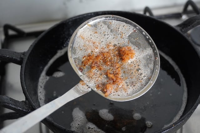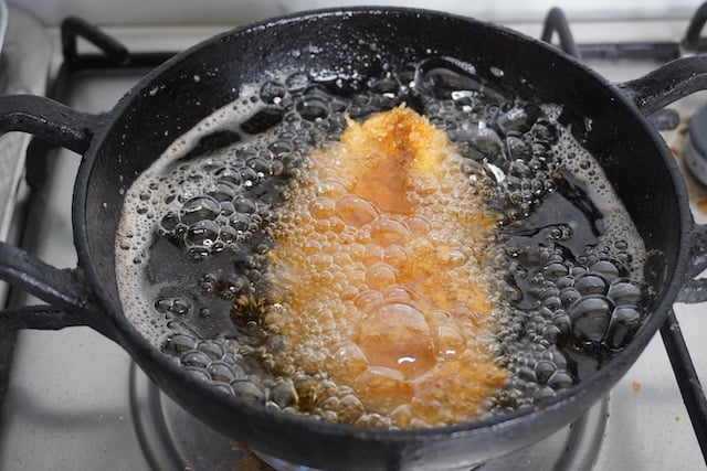 17)After every batch, use a skimmer to remove any fried crumbs from the oil. So it doesn't burn.