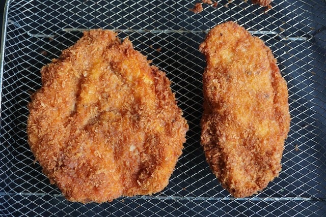 - Take the chicken from batter, let the excess batter drip off, Drop the chicken on some panko breadcrumbs. Coat both sides of the chicken in panko really well. Once it is well coated, remove the chicken and place it on a wire rack.