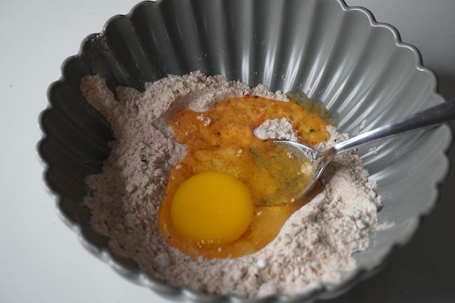 6)Crack open one egg and add it into the flour mix. Mix the egg into the flour. If the batter is too thick, you can add a splash of water and mix well.