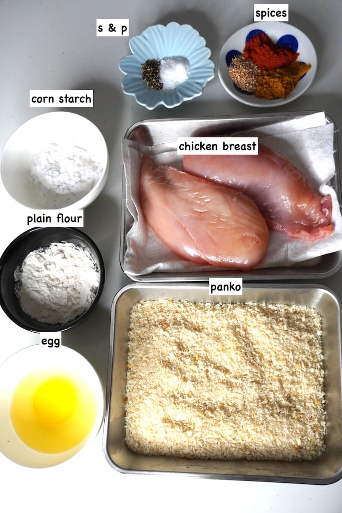 - Breadcrumbs - panko, Japanese style flaky breadcrumbs gives crispiest chicken. If you don't have panko, the next best choice would be freshly pulverised white bread.