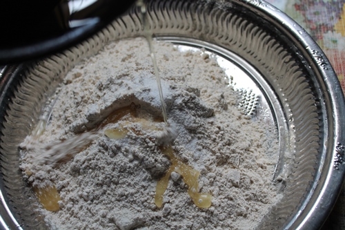 - Start by making dough, take flour, salt, oil in a bowl. rub well so oil is mixed in with the flour.