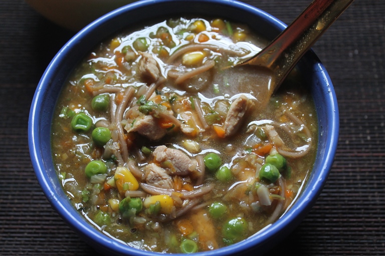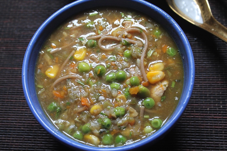 Chicken Noodles Soup is very comforting and a filling soup. It is a one bowl comforting soup. It has lots of veggies and noodles as well. I added chicken in this, you can skip that if you want to make it completely veg. And i added soba noodles in this, you can use any noodles.