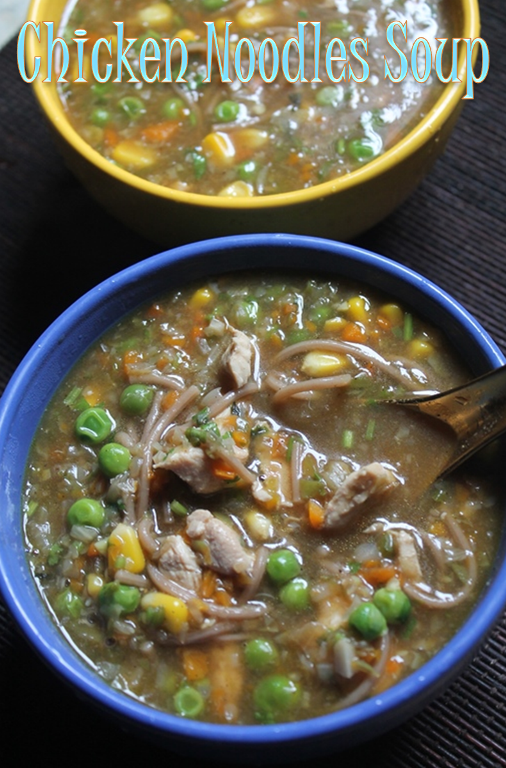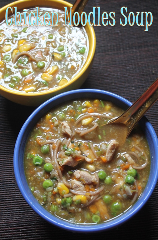 Chicken Noodles Soup recipe with step by step pictures. This recipe is added with veggies and chicken which makes a good filling.