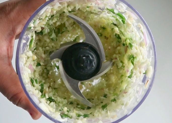- Take garlic, onion, spring onions, ginger in a food processor and chop it finely. If you don't have a food processor, use your knife to chop it pretty finely. Set aside in a bowl.
