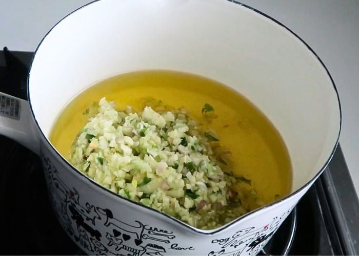 - Take a sauce pan. Add in oil, I used refined oil in this recipe. Add the chopped ingredients in cold oil. Now heat the sauce pan and cook this on very low heat for 10 to 15 mins stirring constantly. You have to cook this mixture on very low heat so the garlic, onion crisp up beautifully without getting burnt. First the mixture will start to foam up because of the water content in onion and garlic, later the ingredients start to get crisp.