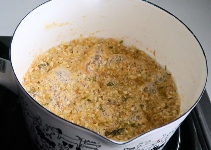 3)First the mixture will start to foam up because of the water content in onion and garlic, later the ingredients start to get crisp. After 10 mins or so you can see the garlic get crispy.