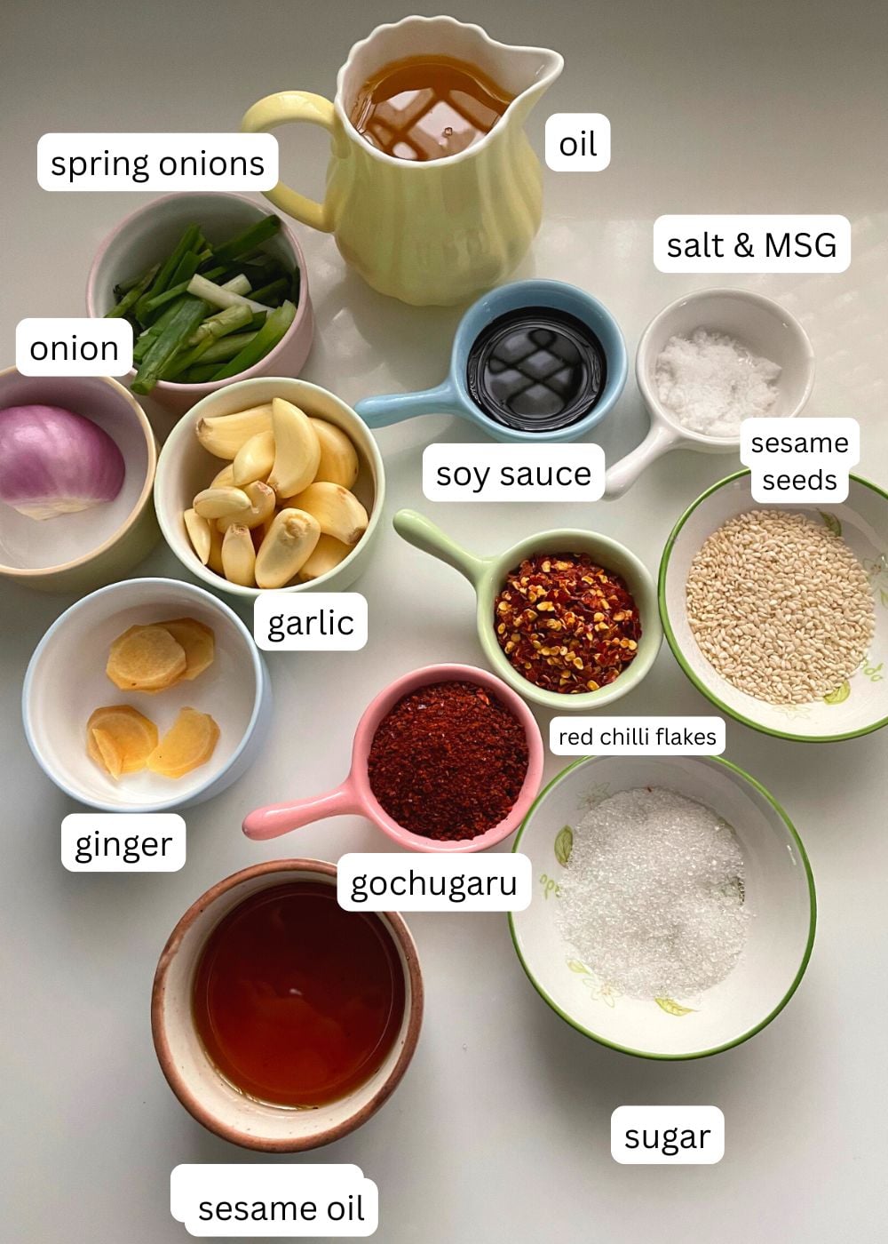 Chilli Flavourings- a combination of hot red pepper flakes and gochugaru my chilli oil. The red pepper flakes add is the spice and gochugaru add the colour. You can skip gochugaru and use paprika or chilli powder instead.
