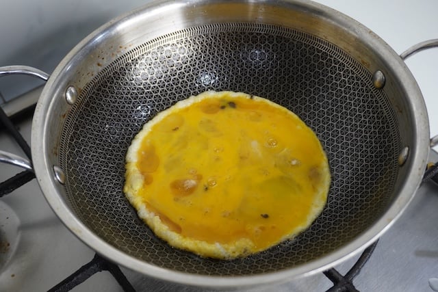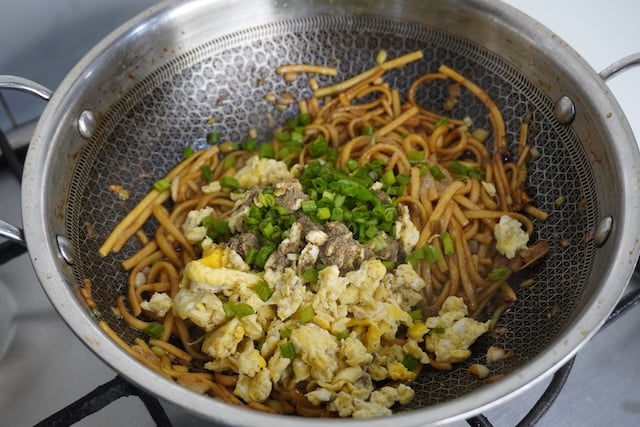 - Use a wok or wide pan to stir fry the noodles and eggs.