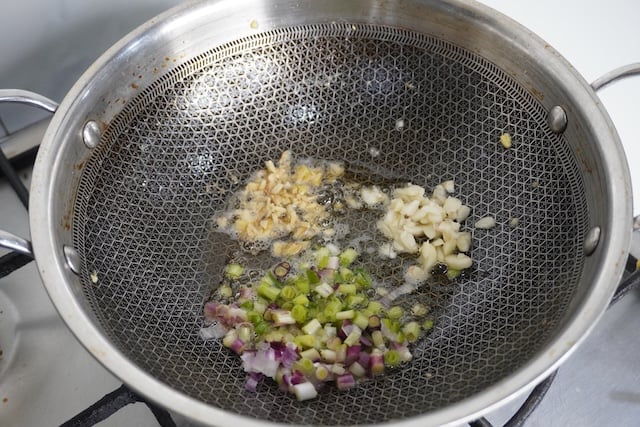 4)Heat a wok on high heat. Add 3 tblspn oil, add in ginger, garlic and spring onion white part alone.
