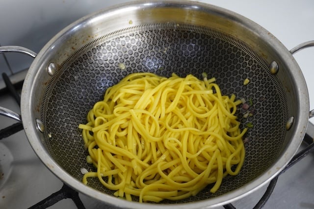 6)This is how I cook my noodles. Cook Egg noodles as per package instructions. Strain through colander completely. Rinse under cold water rubbing to remove any excess starch. Add a teaspoon of oil and coat the noodles with it, so the noodles won't stick together.