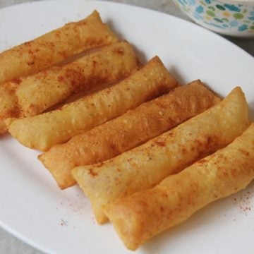- Heat oil for deep frying. Once hot, drop in the strips in hot oil. It will puff up. Flip over and fry on other side too. Fry till crispy and strain it on some paper towel.
