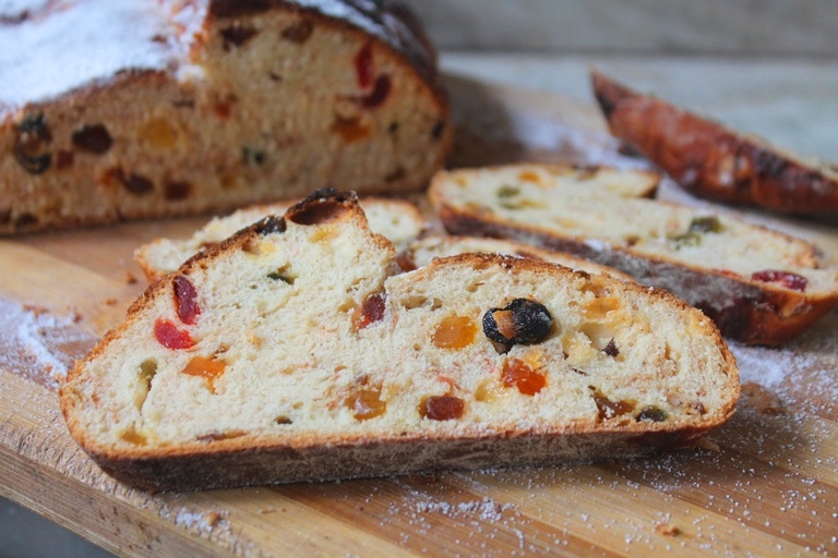 WIKI: Stollen is a fruit bread containing dried fruit and often covered with powdered sugar or icing sugar. The bread is usually made with chopped candied fruit and/or dried fruit, nuts and spices. Stollen is a traditional German bread usually eaten during the Christmas season, when it is called Weihnachtsstollen (after "Weihnachten") or Christstollen (after Christ).