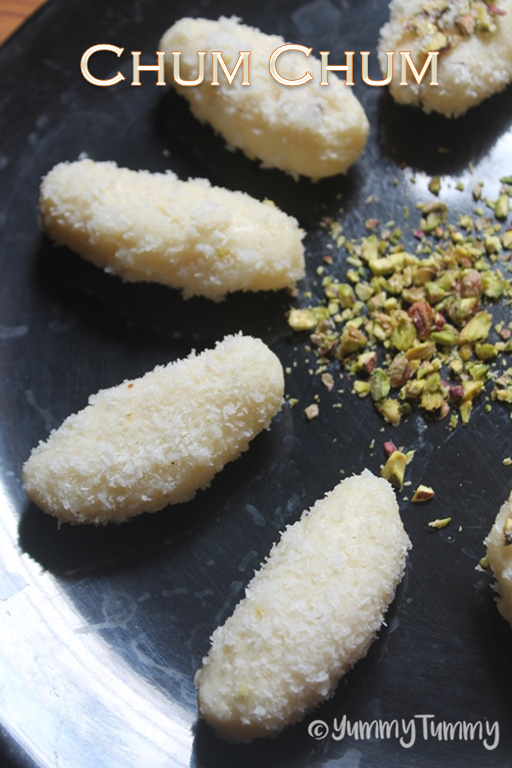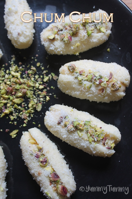 Chum chum is a popular bengali sweet which is made by stuffing rasgullas with khoya, nuts and rolled in coconut.
