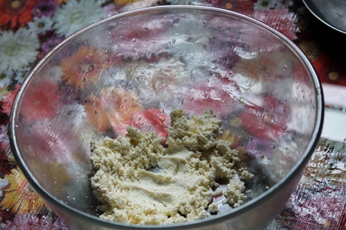 - After 30 mins, take the chenna in a bowl and knead it gently, by rubbing with your palms and knuckles till you get a soft dough.
