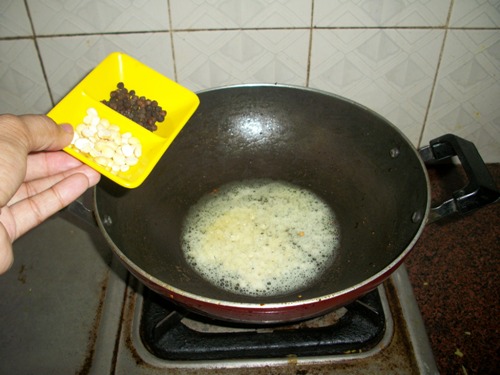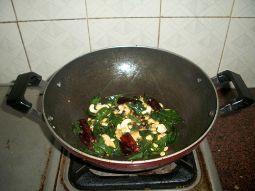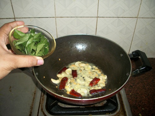 - Add Channa Dal, Pepper, Cashews, Cardamom, Dry Red Chilli and Curry leaves. Saute this for 30 sec.