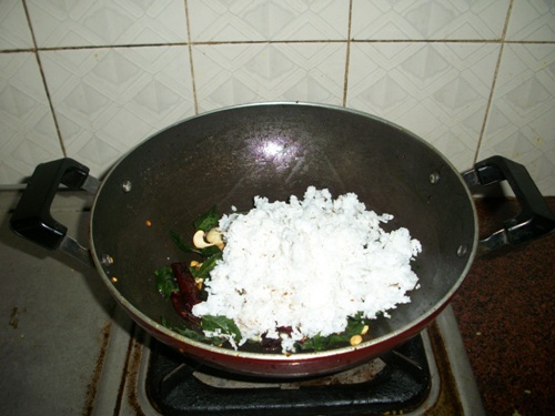 - Add in Coconut and mix well. Add some salt and sauté till it gets light golden.
