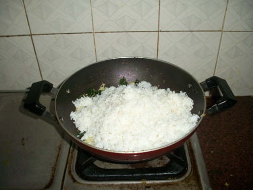 - Now add in rice and mix well..Fry this for 3 mins until the rice is heated through.
