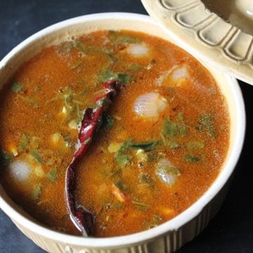 Udupi sambar : This is a popular Karnataka style sambar recipe made with freshly roasted species and coconut. It has the balanced flavours of sweet, spice and tangy. Perfectly paired with rice, idli, dosai and pongal.