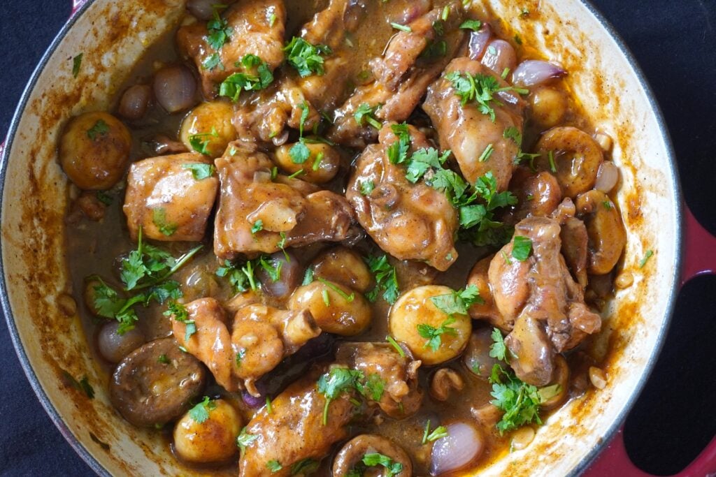 This thick glossy chicken stew taste perfectly with mashed potatoes, rice or serve with crusty bread.