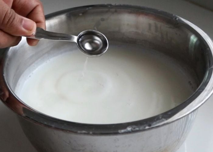 - Once the milk reaches this stage. Add in vinegar and mix well. Cover the pan with a lid and set aside for 30 mins.